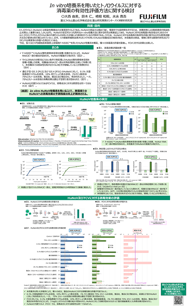 2025/7/10~7/12 | 第40回 日本環境感染学会総会・学術集会 | In vitro ヒトノロウイルス (HuNoV) 培養系を用いた消毒効果の評価方法と代替ウイルスを用いた従来法との比較 |