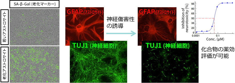 iPS細胞由来神経系細胞を用いて、筋萎縮性側索硬化症(ALS)やアルツハイマー病(AD)を始めとする神経系の疾患モデルを構築し、薬効評価を行います。また、細胞老化技術や神経細胞/アストロサイト/ミクログリア共培養技術を活用し、お客様のご要望に応じた薬効評価系構築が可能です。