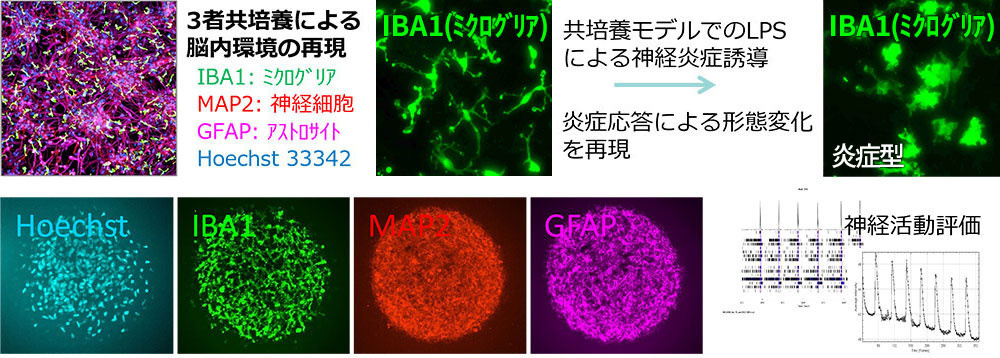 神経変性疾患に深く関与する神経炎症において、ミクログリアの役割が注目されている。iPS細胞由来ミクログリア単独培養では、活性化状態に特徴的なアメボイド型を示したのに対し、アストロサイトや神経細胞と共培養することにより、ミクログリアが健常者のヒト脳内に近い多分岐型の形態を示した。また、炎症刺激であるLPSにより、3者共培養中のミクログリアが多分岐型からアメボイド型へと変化すること、さらには、LPS刺激による細胞の活性化が、ミクログリアからアストロサイトへ伝えられていくことを示した。神経炎症の理解に貢献することが期待できる。 | |