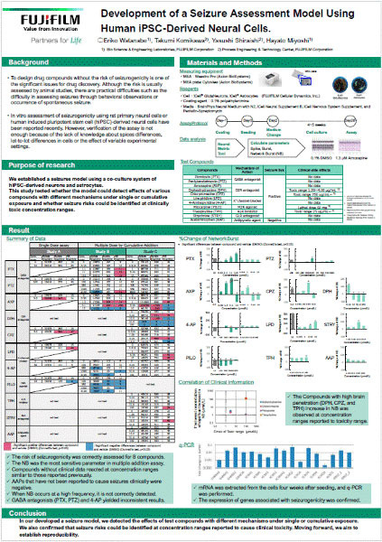 | 2024 | NEURO2024(第47回日本神経科学大会) | Evaluation system for seizure risks using a co-culture system consisting of human iPS cell-derived neurons and astrocytes (M. Taniguchi, H. Kobayashi, S. Endoh-Yamagami) | 痙攣は非臨床段階での発生頻度が最も多い神経毒性であるが、痙攣リスクの評価は動物試験に依存しており、種差やスループットの観点よりヒトin vitro評価系が求められている。ヒトiPS細胞由来の神経細胞、アストロサイトからなる共培養システムを用いて、カルシウムイメージングを行い、既知の痙攣リスク化合物を評価した結果を報告する。 | |