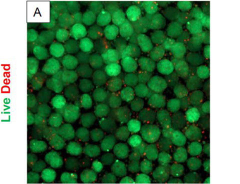 カルセイン-AM (生細胞染色) およびプロピジウムヨードイド (死細胞染色) を用いて、3Dスフェロイドの細胞生存率を測定した。生存率が高く、大規模な細胞死は観察されなかった。