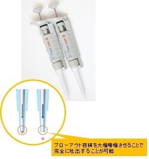 世界初の、ブローアウト容積増幅機構内蔵(特許取得済)ピペットです。微量分注ではチップから試薬が吐出しきれないことがありますが、吐出する際の空気容量を大きくすることで完璧な液切れを実現し、サンプルを膜状に引き戻すことはありません。 大幅な材質変更による改良で、より耐久性とフィット感がアップしました。