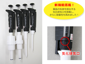 ETFE、気化排気口を導入することにより、耐薬品性を高めました。酸、有機溶剤、アルカリ等のサンプルが計量可能なモデルです。専用アダプターを装着すればガラスチップも使用可能です。
