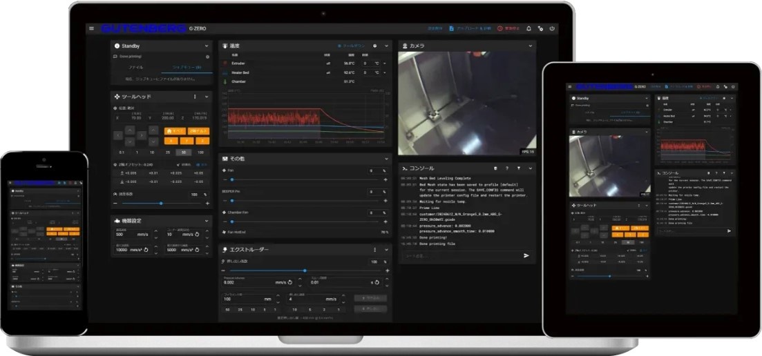 G-ZERO L1 / G-ZEROは本体だけでなく同一LAN内にあるPCやタブレットからブラウザ経由で操作することも可能です。造形中の温度や速度、映像などを監視することができるので3Dプリンターの前に張り付いて上手くいっているか気を揉む必要はありません。