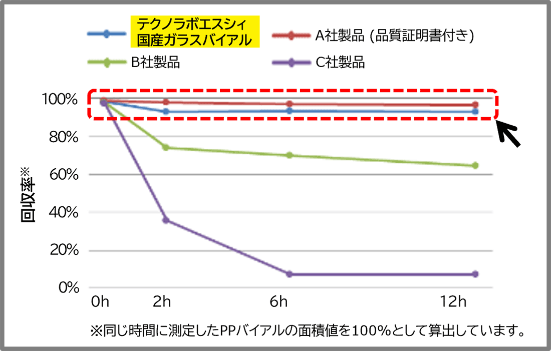 ガラスへの吸着性が高いことで知られるジクワットを試料として用い、 バイアルへ封入後12時間までの回収率をHPLCで測定しました。