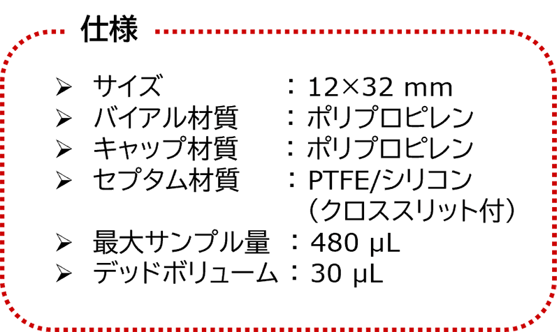 また、セプタム付キャップには圧着型セプタムを採用し、セプタムの落下防止と優れた気密性を実現しています。