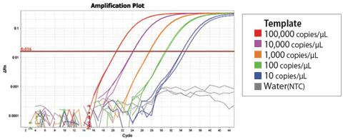 陽性コントロール(本品)の 100,000 copies/μL から10 copies/μL までの5段階希釈系列を添加した。また、陰性コントロールとして、Water, Nuclease free を添加した。
