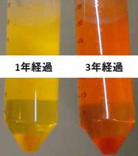 右の図は、冷蔵庫に遮光状態で保管し1年と3年経過したPhenol/Chloroform/Isoamyl alcohol (25:24:1)から、フェノール層を褐色ガラス瓶から透明な容器に移し替えたあと撮影した写真です。