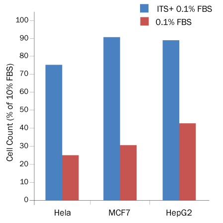 Hela、MCF7、およびHepG2細胞を、10% FBS含有培地、低血清(0.1 % FBS)培地、またはITS Media Supplement + 0.1 % FBS培地で培養した。細胞はトリプシン処理後に回収し、細胞数を測定した。各細胞株について、細胞数は標準の10 % FBS含有培地(100 %)を基準に正規化した。