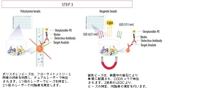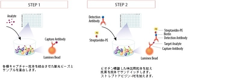 500種類に塗り分けられた専用ビーズの表面に抗体をカップリングし、多種のビーズを混合して使用することでタンパクの多項目同時測定が可能となっています。 測定は専用装置で行い、検出法はビーズの種類に応じて二通りあります。