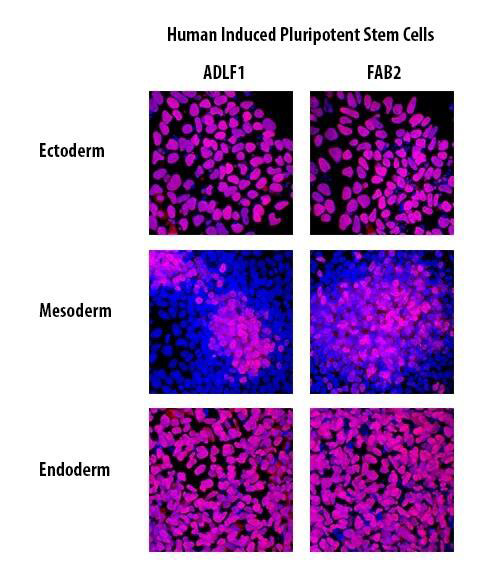 ヒト誘導性多能性幹細胞株2株(ADLF1およびFAB2)を、Human Pluripotent Stem Cell Functional Identification Kit(カタログ番号 SC027B)に含まれる培地補足剤を使用して、外胚葉、中胚葉、内胚葉に分化させた。