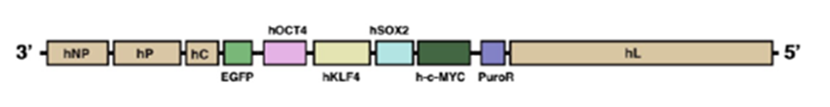 SRV™ iPSC-1 Vectorは、主に線維芽細胞からiPS細胞を作製するように遺伝⼦発現レベルを最適化した製品で、OCT3/4, KLF4, SOX2, c-MYCの4つのヒト由来の初期化遺伝⼦とEGFP、Puro耐性遺伝⼦を搭載しています。ステルス型RNAベクターを siRNA※の導⼊により除去するベクターです。
