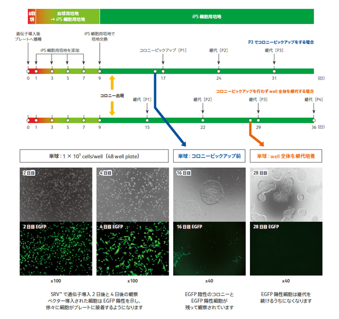 iPS細胞作製フロー︓ SRV™ iPSC-2 Vectorを使って⾎球細胞(単球)からiPS細胞を誘導した実施例