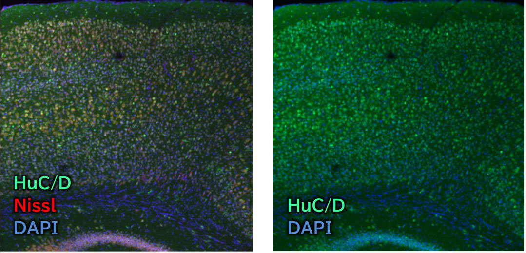 | 使用例 | <マウス脳凍結切片の免疫染色例> 灌流固定 :0.1%クエン酸ナトリウムPBSによる脱血後、4%PFA灌流 後固定 :4%PFA(24時間) スクロース置換:30%スクロースPBS(4 ℃, 一晩~2日程度) 凍結切片作製 :スクロース除去後、凍結包埋ブロックを作製し、クライオスタットによる30 μm厚スライス作製 グリシン処理 :25 mMグリシンPBS(20分程度) ブロッキング :5%正常ヤギ血清, 0.3%TritonX-100/PBS(4 ℃, 一晩) 一次抗体 :抗HuC/D, モルモット(1:1,500), 1%正常ヤギ血清, 0.3%TritonX-100/PBS(4 ℃, 一晩~2日) 洗浄 :0.3% TritonX-100/PBS(5分×3回) 二次抗体 :Alexa Fluor (R) 488 AffiniPure Goat Anti-Guinea Pig IgG (H+L) (1:500), 1%正常ヤギ血清, 0.3%TritonX-100/PBS(室温, 2時間) 洗浄 :0.3% TritonX-100/PBS(5分×3回) 封入 :4 ℃, 暗所保存 |
