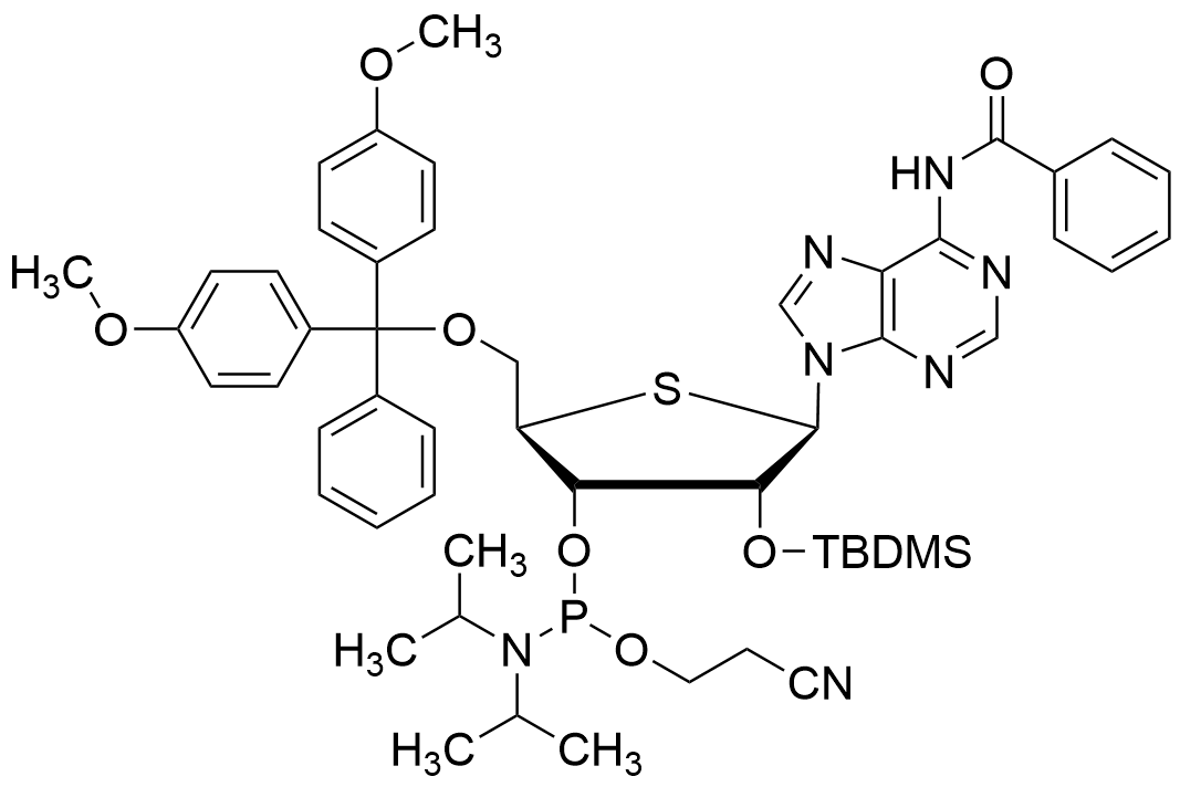 | 概要 | 4'-チオ糖核酸は核酸糖部の環内酸素原子を硫黄原子へと置換した化合物です。本品は、RNAアミダイトの2'-TBDMS保護体です。 |