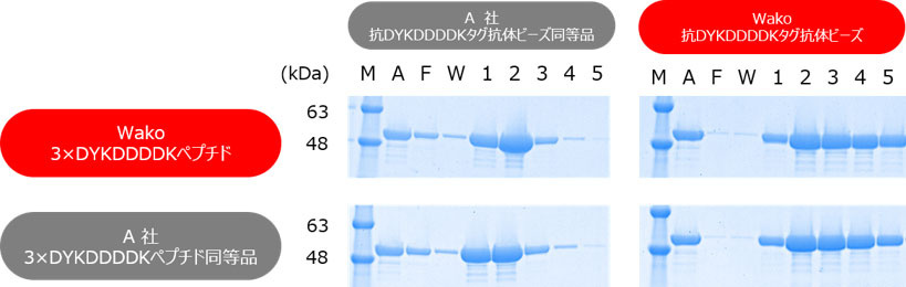 当社抗DYKDDDDKタグ抗体ビーズおよび、A社同等品のいずれの場合においても、 最初の溶出画分からDYKDDDDK-BAPが検出され、同等の溶出性能を持つことが示された。
