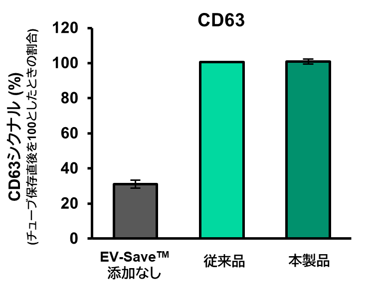 精製EV溶液にEV-Save™ 細胞外小胞ブロッキング試薬 (コードNo. 058-09261、以下 従来品) およびTFF用EV-Save™ 細胞外小胞ブロッキング試薬 (以下 本製品) を1/100量となるようにそれぞれ添加した。その後、マイクロチューブを移し替え、48時間保存した。EV量はCD63とCD81のELISAで測定した。