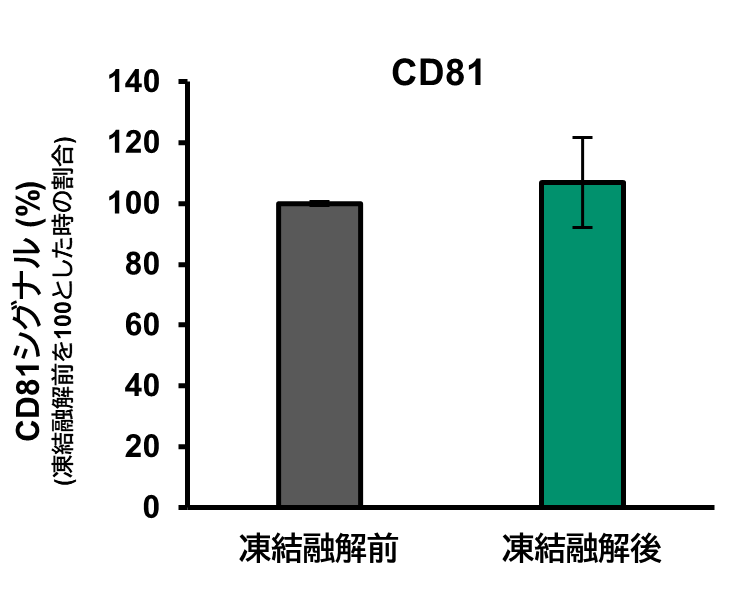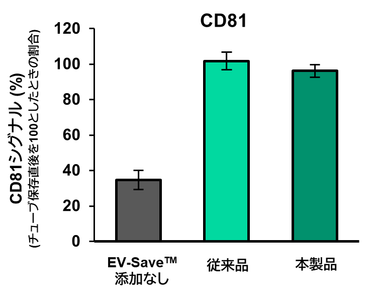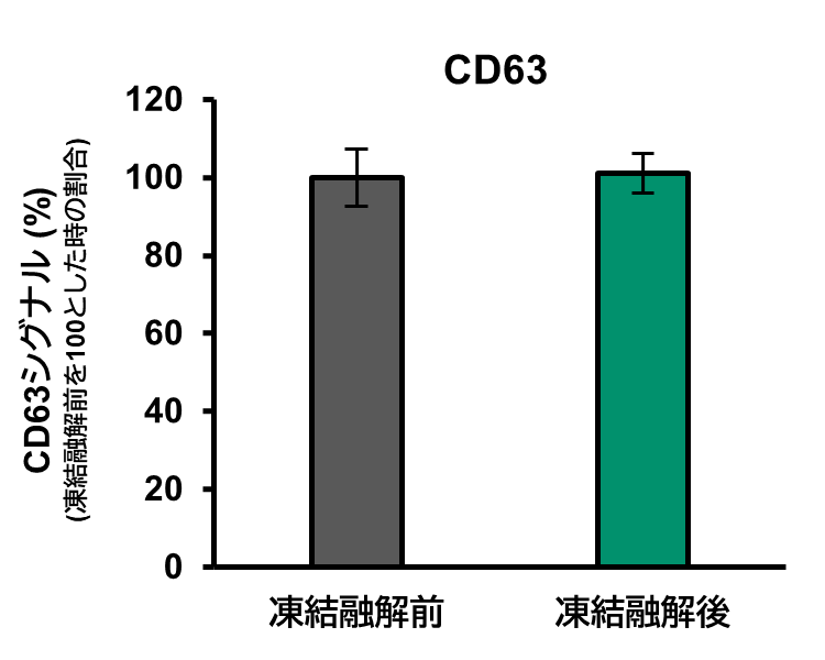 TFFを用いて、骨髄由来間葉系幹細胞 (BMMSC) の細胞培養上清からEVを精製した。精製EV溶液に本製品を1/100量となるように添加した後、3回 凍結融解 (-20°Cから室温) を行った。凍結融解前後のEV量をCD63とCD81のELISAで測定した。