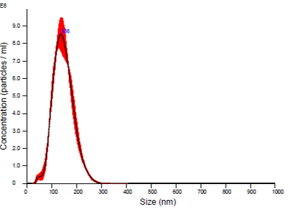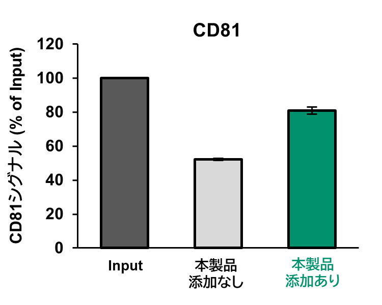 TFFを用いて細胞培養上清を20倍に濃縮した。その後、100倍でバッファー交換を実施した。本製品は細胞培養上清と置換用バッファーそれぞれに1/100量となるように添加した。精製したEVの回収率はCD63とCD81のELISAで、粒子分布はNanoparticle Tracking Analysis (NTA) で測定した。
