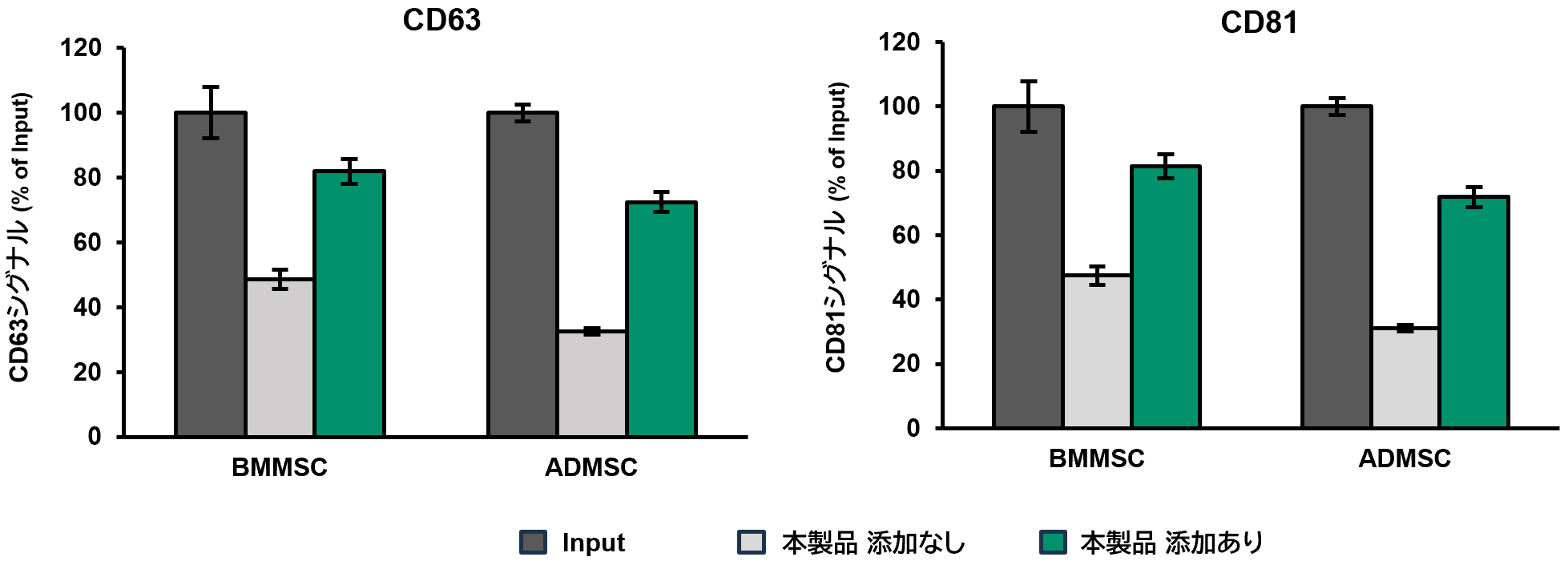 MassivEV™ EV Purification Column PS (コードNo. 131-19491) を用いて骨髄由来間葉系幹細胞 (BMMSC) および脂肪組織由来間葉系幹細胞 (ADMSC) の細胞培養上清からEVを精製した。その後、Repligen社のTFFシステムで、本製品を1/100量添加したHBSバッファーへバッファー交換をした。PS Capture™ エクソソームELISAキット(ストレプトアビジンHRP) (コードNo. 298-80601) を用いて、バッファー交換後のEV回収率を評価した。 検出抗体には抗CD63抗体もしくは抗CD81抗体を使用した。EVの粒子分布はNanoparticle Tracking Analysis (NTA) で測定した。