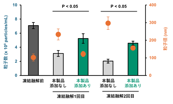 本製品の添加によって、凍結融解で生じるリポソームの減少が抑制された。また本製品を添加しなかった対照群では粒子径の増加が認められたが、本製品を添加した群では粒子径に大きな変化は確認されなかった。