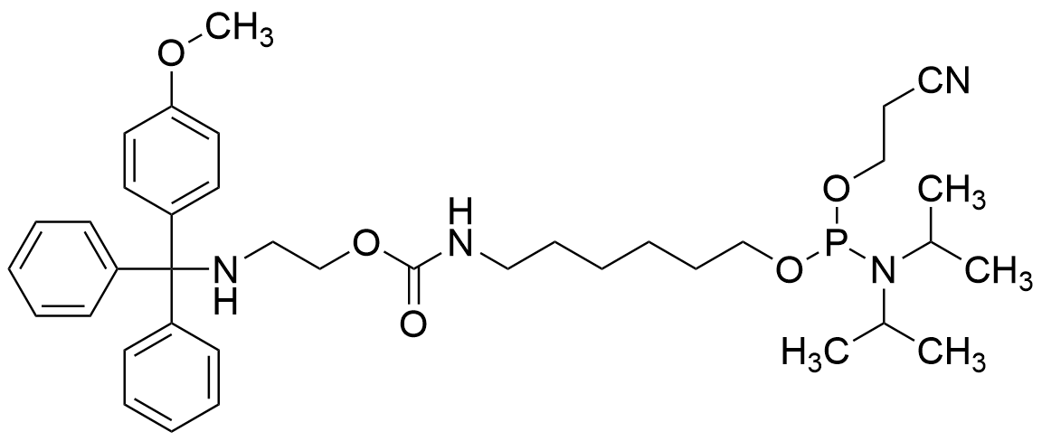| 概要 | 本品は核酸の末端修飾用リンカーです。ssHリンカーは、アミノ基の近傍にカルバメート基を導入した構造を持つリンカーです。従来型アミノリンカーよりも高い反応性を示し、核酸の修飾を効率的に行うことができます。さらに、カルバメート基の導入により、アミノ基のpKaや化学的性質が変化し、保護基であるMMTr基を温和な条件下で迅速に脱保護することができます。 |