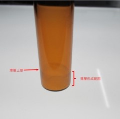 バイアル内の薄層 (例) 本製品は容量が微量であるため、内容物をほとんど視認できないことがあります。蛍光灯の下で確認すると、バイアルの壁面に薄層が観察できます。