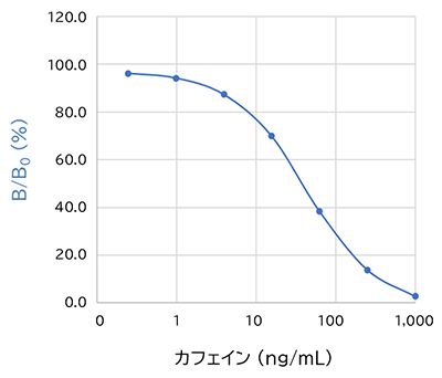 本キットは競合ELISAであり、検体由来のカフェインが多いほど吸光度は減少します。