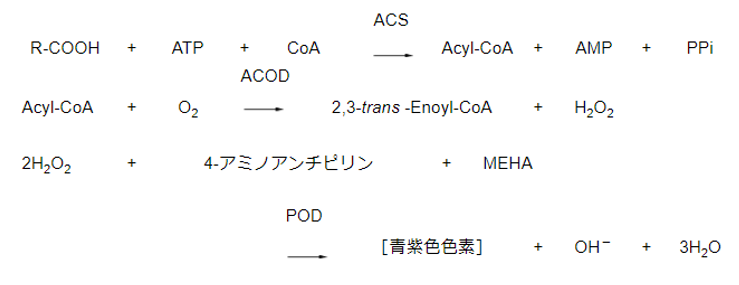 本品はアシルCoA シンセターゼ(ACS)とアシルCoAオキシダーゼ(ACOD)及び3-メチル-N-エチル-N -(β-ヒドロキシエチル)-アニリン(MEHA)を利用した青紫色発色系の酵素法試薬です。体外診断用に用いることはできません。