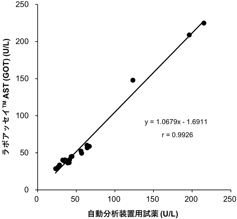 ラボアッセイ™ AST (GOT) と自動分析装置用試薬の測定値には高い相関が確認できた。