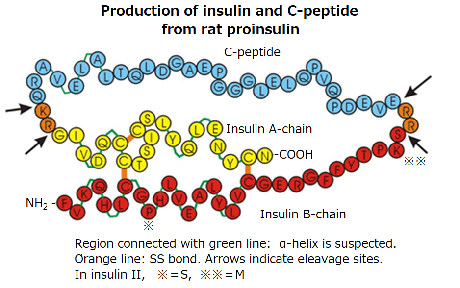 Proinsulin is a precursor of insulin and C-peptide. It is synthesized in pancreatic islet β-cells as a single polypeptide chain consisting of 86 amino acids, with a molecular weight of approximately 9,400 Da. After synthesis, it is transferred to secretory granules. During this process, disulfide bonds are formed, and enzymatic cleavage converts proinsulin into insulin and C-peptide. A small amount of uncleaved proinsulin remains in the secretory granules and is released into the bloodstream along with insulin and C-peptide upon granule secretion. The biological activity of proinsulin is reported to be 5–10% that of insulin. Because proinsulin contains the amino acid sequences of both insulin and C-peptide, assays designed to measure insulin or C-peptide in blood may also detect proinsulin. Therefore, when blood insulin levels are quantified using immunoassays, the result is referred to as immuno-reactive insulin (IRI), which includes proinsulin and is distinct from insulin alone. The ratio of proinsulin to insulin is considered to reflect the status of insulin biosynthesis.