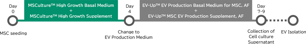 Compared with conventional MEMα and other growth media for MSC, this product provides enhanced proliferative capacity. MSCs expanded using this medium can subsequently be cultured in EV-Up™ EV Production Basal Medium/Supplement for MSC, enabling efficient, large-scale production of extracellular vesicle (EV), including exosome.