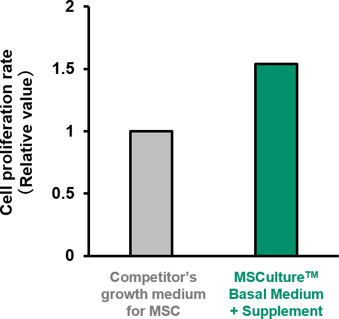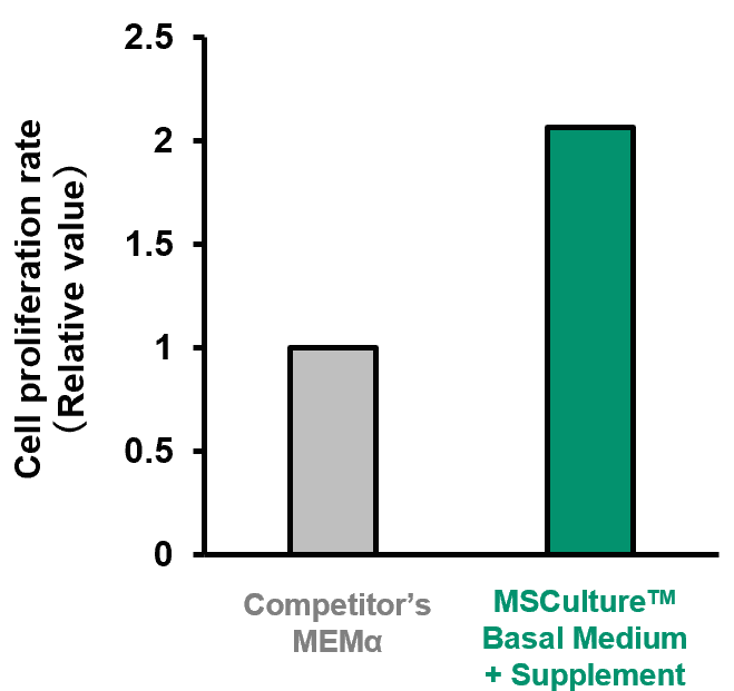 The cell proliferation rate of bone marrow-derived MSCs was evaluated using this product, and competitor’s MEMα and growth medium for MSC.
