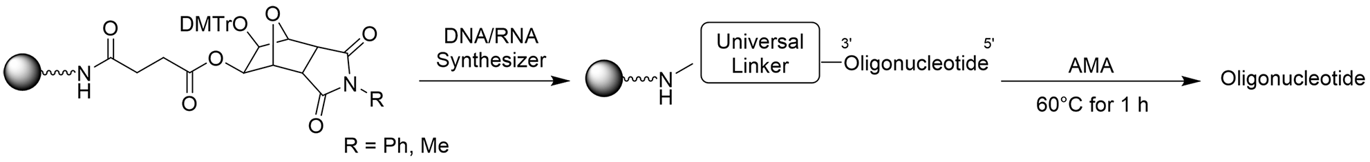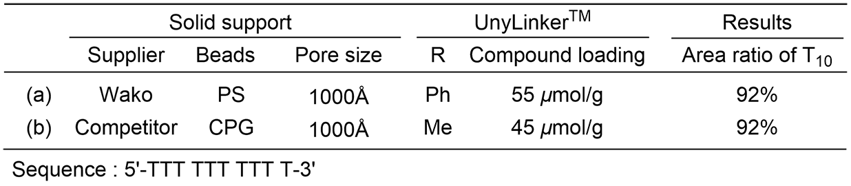 Figure HPLC analysis of ONs released from T10-loaded (a) UnyLinker™ PS 1000Å (R=Ph) and (b) UnyLinker™ CPG 1000Å (R=Me) under Basic conditions. Basic condition: AMA at 60℃ for 1 h.