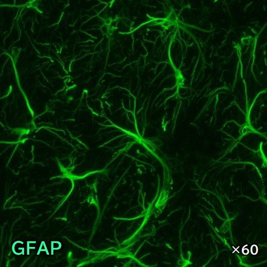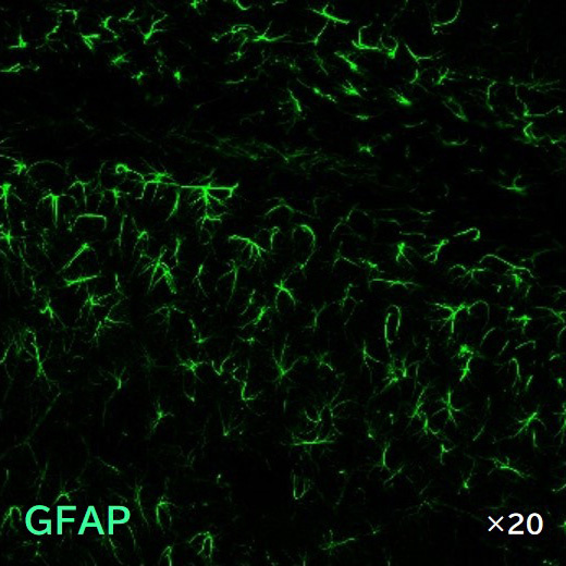 GFAP is thought to play a role in the structural organization of astrocytes. Previous studies have also shown that it is essential for the proliferation of reactive astrocytes and the formation of glial scars2-3). Reactive astrocytes are cells that undergo morphological changes—such as process elongation and cellular hypertrophy—in response to central nervous system injury caused by trauma or neurodegenerative diseases. GFAP expression is known to increase under such pathological conditions compared to the normal state2-3). Moreover, circulating GFAP has attracted attention as a biomarker that reflects neuroinflammatory states in neurodegenerative diseases, including Alzheimer’s disease.