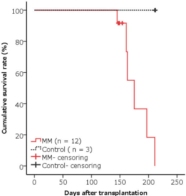 Kaplan-Meier curve of survival rate in the MM xenografts.
