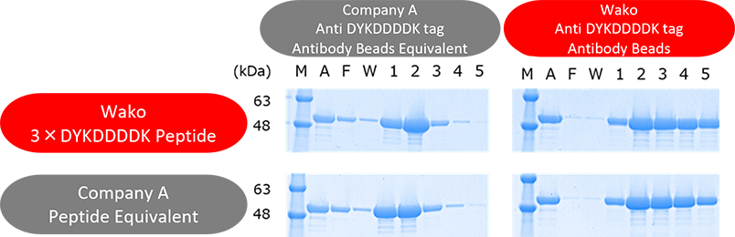 DYKDDDDK-BAP was detected in the first elution fraction when using either our anti-DYKDDDDK tag antibody beads or equivalent beads from Company A, demonstrating comparable elution performance.