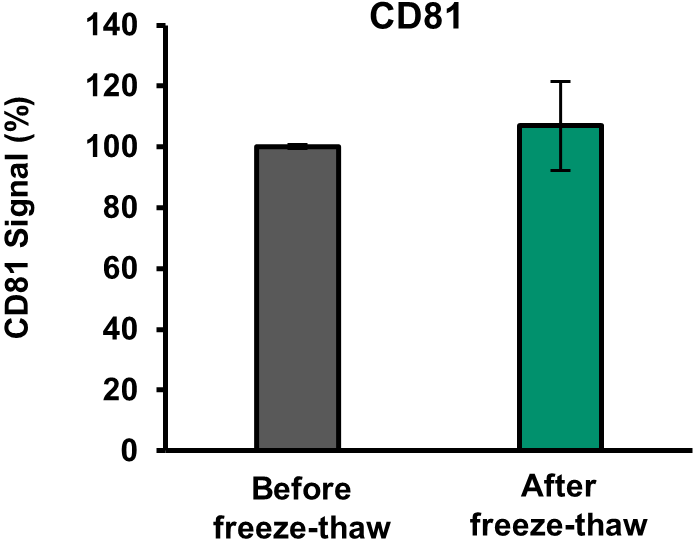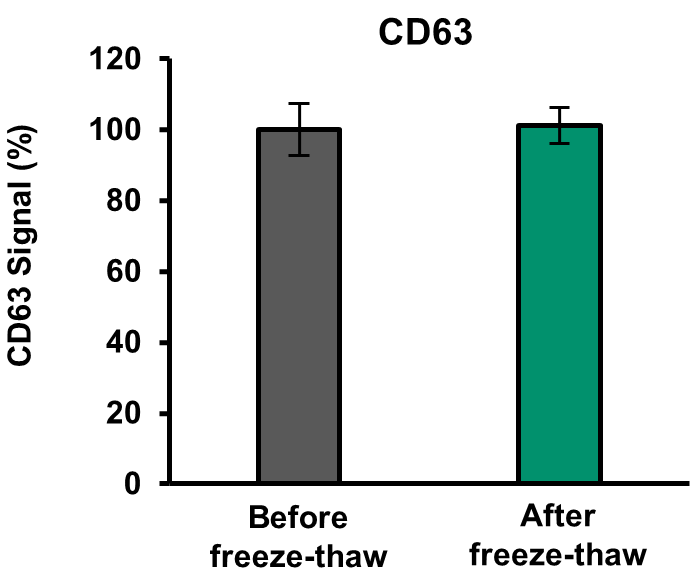 EVs purified from BMMSC cell culture supernatants using TFF were mixed with this product at a 1:100 dilution, then subjected to three freeze-thaw cycles (-20 °C to room temperature). EV levels before and after freeze-thaw were assessed using ELISA with anti-CD63 and anti-CD81 antibodies. For the figure, the value before freeze-thaw is set to 100.