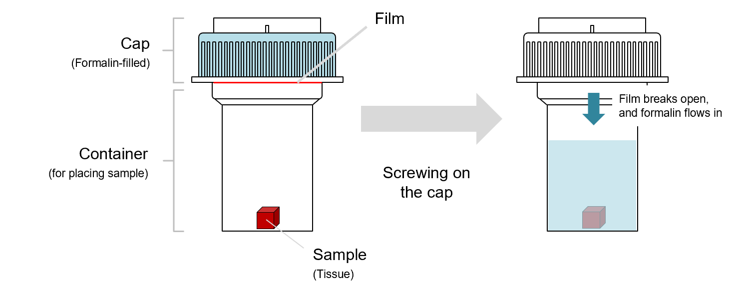 - Simply by tightening the cap after placing a sample in the container, the container is filled with formalin